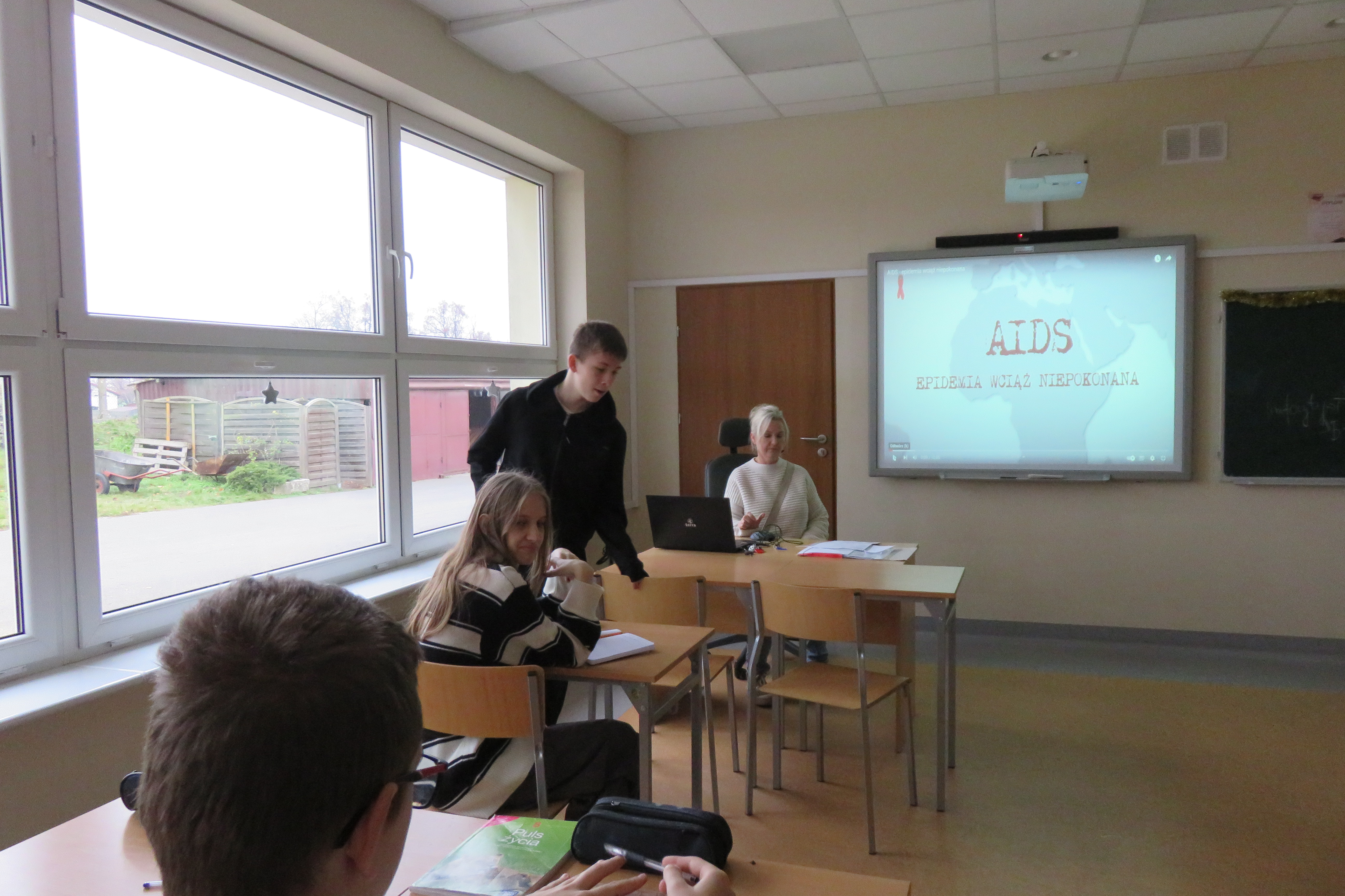 W dniu 1 grudnia obchodziliśmy w naszej szkole Światowy Dzień AIDS. Uczniowie klasy VII przygotowali gazetkę tematyczną na korytarzu, a na lekcjach biologii w klasach V-VIII odbyły się pogadanki z młodzieżą o przyczynach choroby, objawach, sposobie leczenie, profilaktyce i drodze zakażenia się wirusem HIV. Uczniowie obejrzeli również film dydaktyczny pt. „AIDS - epidemia wciąż niepokonana”.