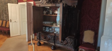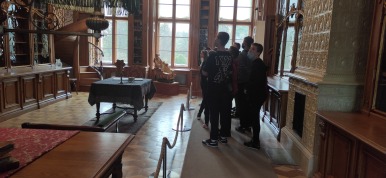 W pierwszej kolejności pojechaliśmy do rogalińskiego pałacu, który jest nie tylko spektakularną bryłą, ale również zawiera niezwykłe wnętrza i elewacje. Najpierw poszliśmy do ciekawego miejsca, jakim jest powozownia. Zawiera ona budzące zachwyt karety – w tym czteroosobową karetę pięciookienną, dwa powozy victorie, sanie wyjazdowe – otwarte z futrzanym przykryciem oraz dziecięce saneczki, które były przeznaczone do zabawy z psim zaprzęgiem.