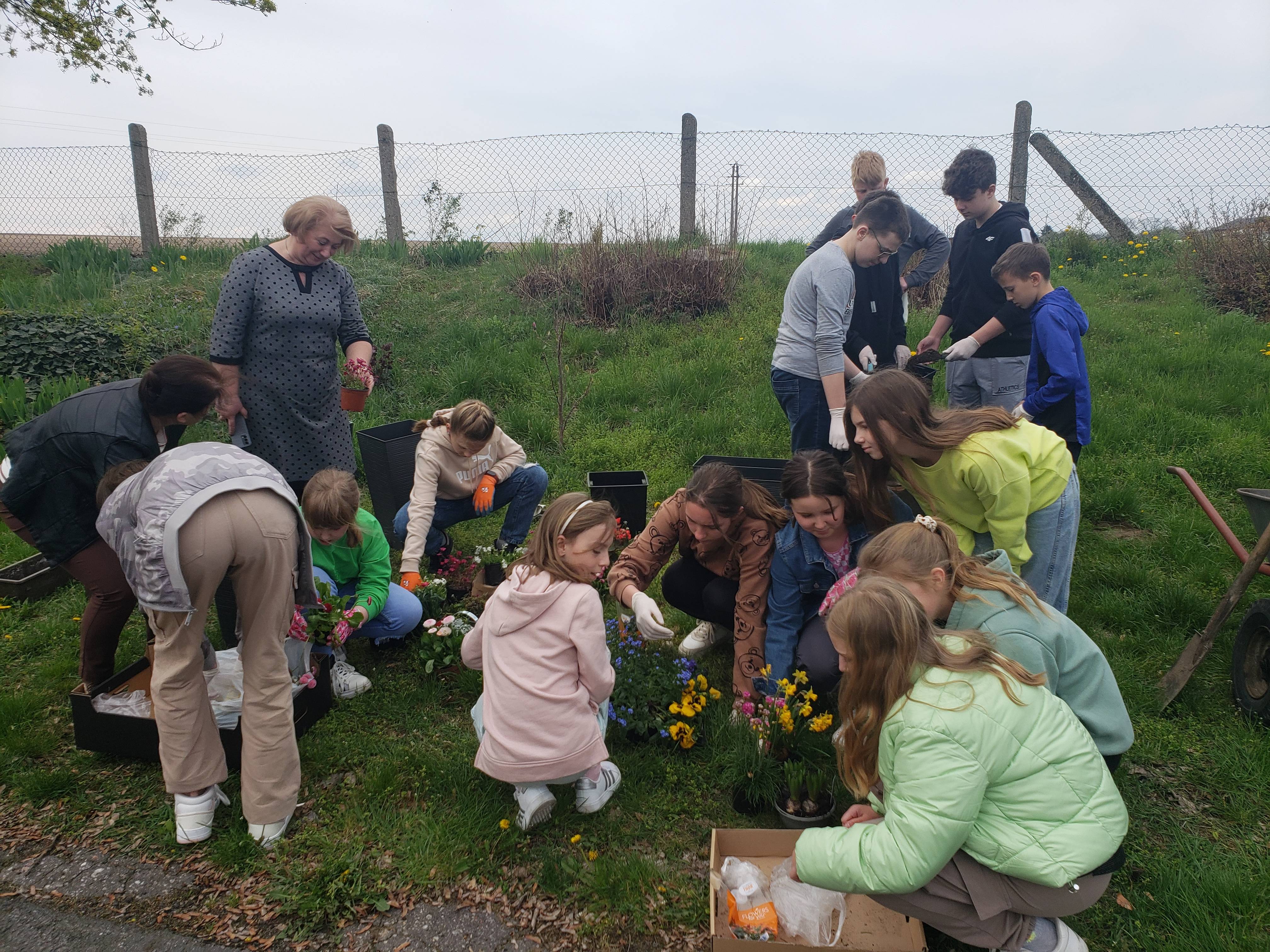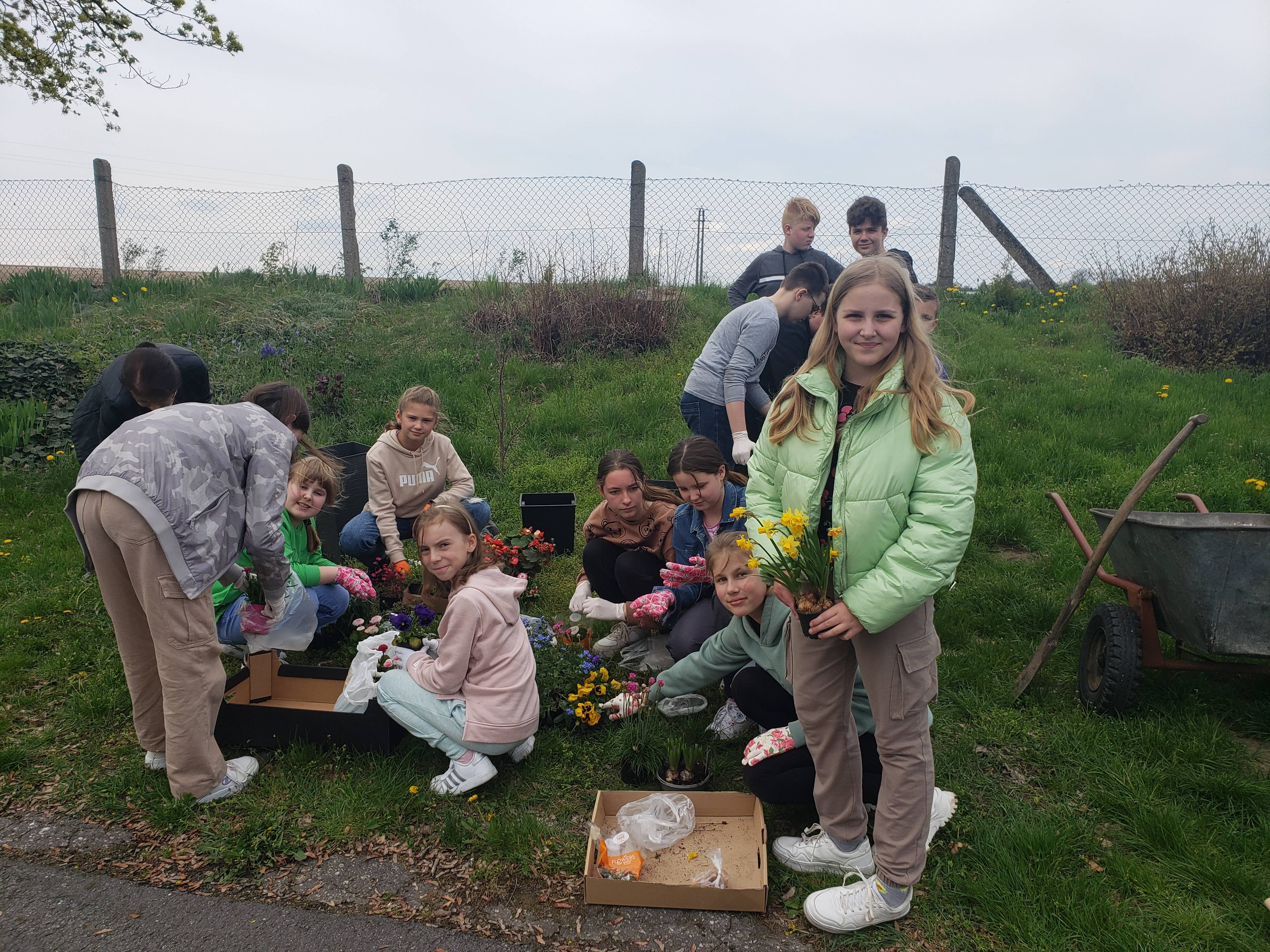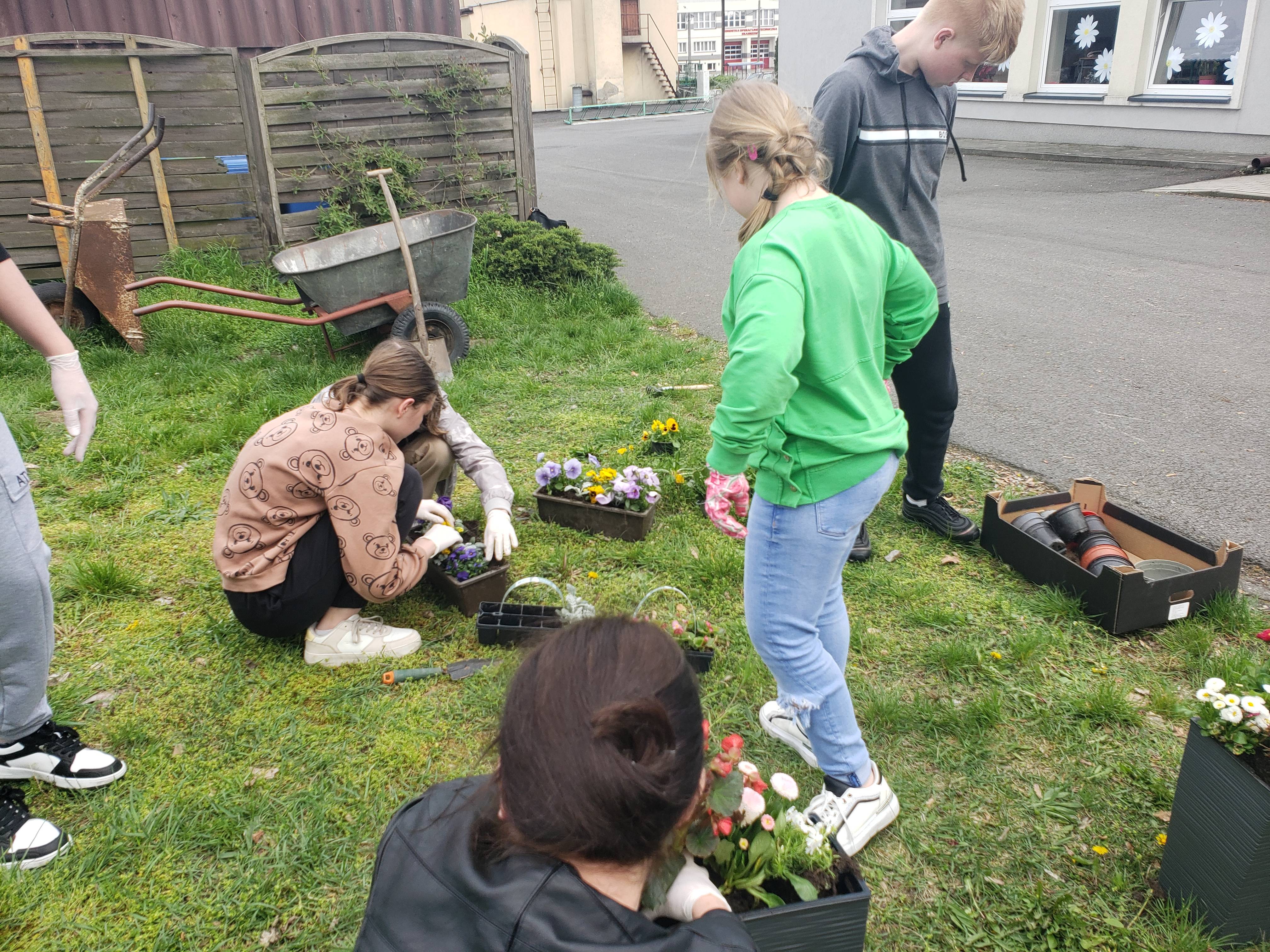Laureatom gratuluję, a wszystkim uczestnikom dziękuję za udział w konkursie. Uczniowie klas 0-8 przynieśli sadzonki roślin do posadzenia w donicach przed szkołą. Wybrani przedstawiciele uczniów klasy 4a oraz klasy 7a pod opieką pani Moniki Raniś i Izabeli Śmieszniak posadzili kwiaty przed głównym wejściem do budynku.
