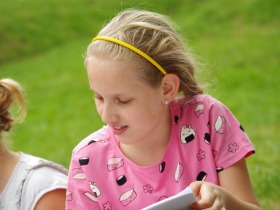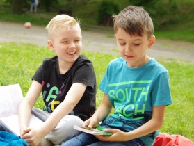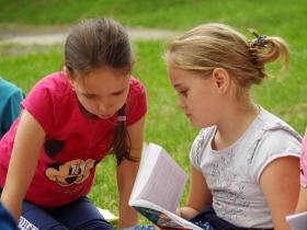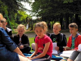 Trzecia klasa czyta na trawie