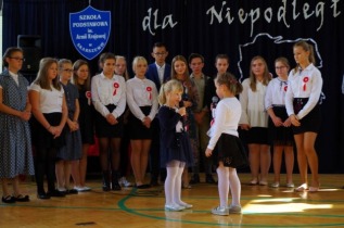 Uroczystym momentem było wprowadzenie wcześniej poświęconego w czasie Mszy Świętej sztandaru. Nastąpiła ceremonia symbolicznego aktu wbijania gwoździ honorowych przez sponsorów. Poczet sztandarowy rodziców przekazał sztandar Dyrektorowi Szkoły, który złożył uroczystą przysięgę. Następnie Dyrektor przekazał sztandar uczniom. Przedstawiciele klas, nauczycieli, rodziców, pierwszaki ślubowali nosić ten sztandar z godnością i honorem.