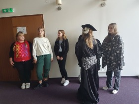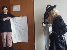 Dnia 11 października 2022 roku uczniowie klasy 7 i 8 uczestniczyli w czterogodzinnych warsztatach teatralnych: „Konwencje i sposoby opowiadania w teatrze”. Przyjrzeli się z bliska ludziom teatru oraz poznali tajniki ich pracy. Wcielali się w rolę reżysera, aktora, scenografa, operatora świateł, realizatora dźwięku czy kostiumografa i próbowali opracować fragment szekspirowskiego dzieła pod tytułem „Makbet”. Ponadto przypomnieli sobie gatunki teatralne. Podczas zajęć wykorzystywane były narzędzia storytellingowe, mapy myśli, zadania z kreatywnego pisania, żeby porozmawiać o tym, czym są i do czego służą konwencje. Dużą radość sprawiło uczniom dobieranie kostiumów do wcześniej wybranych i scharakteryzowanych postaci. Atrakcyjne było także ich przymierzanie i prezentowanie przed grupą oraz granie na różnego rodzaju instrumentach muzycznych i nagrywanie ścieżki dźwiękowej, będącej odzwierciedleniem wyświetlanego fragmentu filmu. Uczniowie uczyli się uważnego słuchania oraz wchodzenia w słowne interakcje uzależnione od danych sytuacji. Zajęcia były naprawę ciekawe, inspirujące, wyzwalające twórcze myślenie oraz kreatywność.