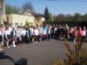 Uczniowie klasy V przybliżyli wszystkim to ważne i znaczące historyczne wydarzenie, przygotowując montaż słowno – muzyczny. W śpiew piosenki „Witaj maj, 3 maj” włączyli się wszyscy uczniowie oraz pracownicy szkoły, a echo ich niosło się po całej okolicy.
