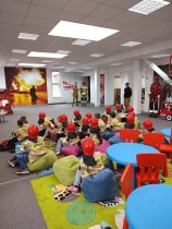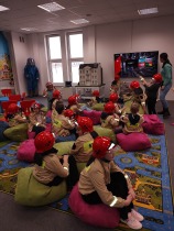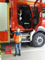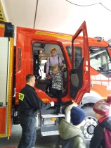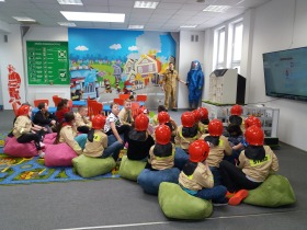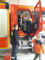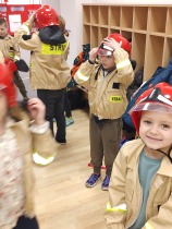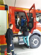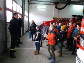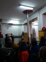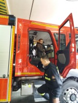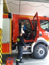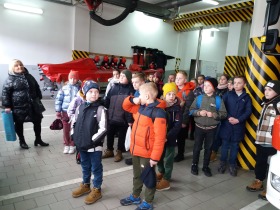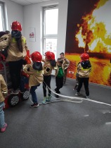 Kolejnym punktem naszej wycieczki była wizyta w Państwowej Straży Pożarnej. Uczniowie naszej szkoły odbyli lekcję w salce edukacyjnej. Była to okazja do pogadanki na temat bezpiecznego zachowania w domu i szkole. Podczas zajęć dzieci zakładały mundury i hełmy strażackie. Wcieliły się w rolę strażaków i brały czynny udział w akcji ratowania kota. W czasie wizyty strażacy zaprezentowali dzieciom i opiekunom pojazdy pożarnicze, sprzęt ratowniczy i gaśniczy. Obserwowaliśmy pokazowy zjazd po ześlizgu. Na koniec odwiedzin dzieci przekazały strażakom podziękowania i życzenia w formie plastycznej.
