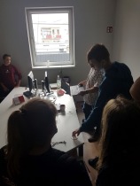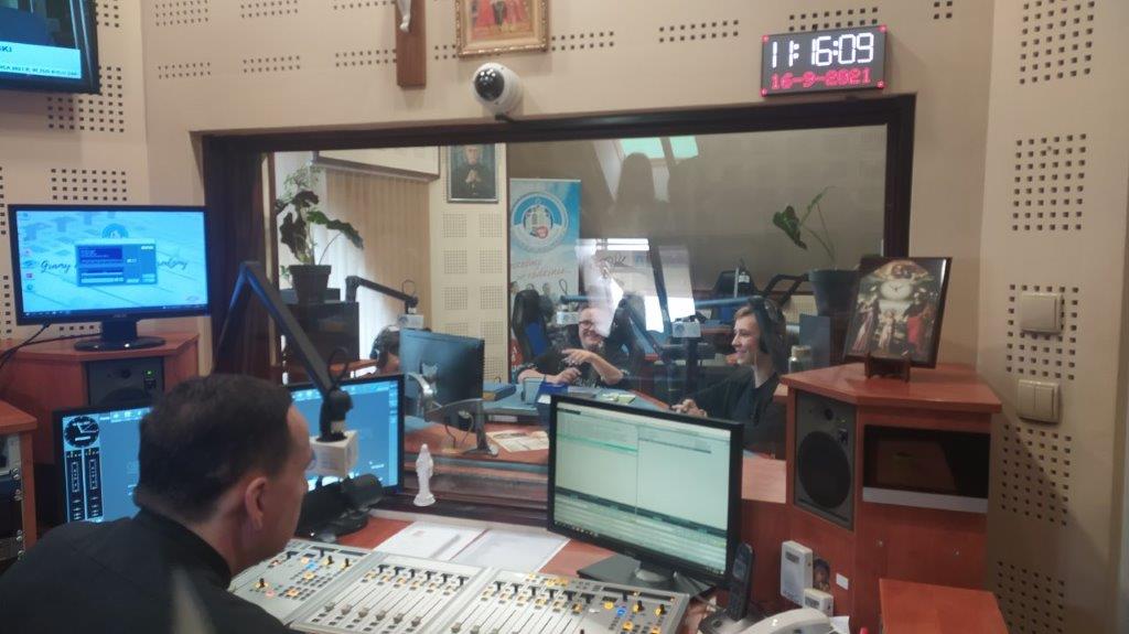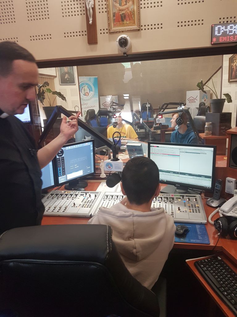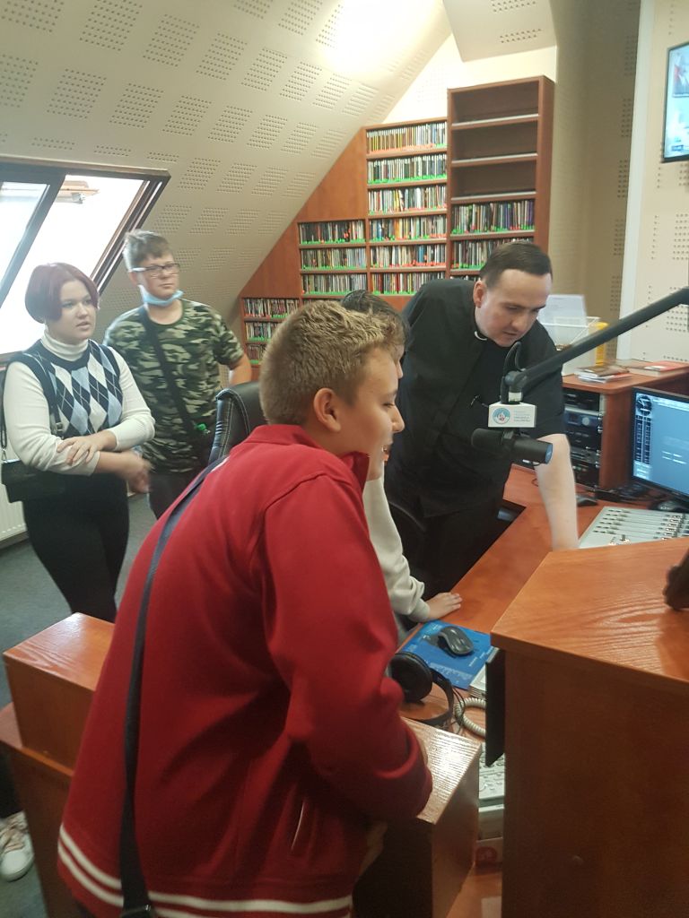 Następnie udaliśmy się do Radia Rodzina, katolickiej stacji radiowej diecezji kaliskiej nadającej swój program na częstotliwości 103,1 FM. Mieliśmy okazję poczuć się jak prawdziwi spikerzy radiowi. Ukazano nam tajniki radia oraz pokazano, jak korzystać z zamieszczonego tam sprzętu. Później ksiądz Damian oprowadził nas po seminarium duchownym, gdzie między innymi mogliśmy zobaczyć pokoje papieskie, w których przez trzy godziny przebywał i odpoczywał Jan Paweł II podczas swojej pielgrzymki w 1997 roku.