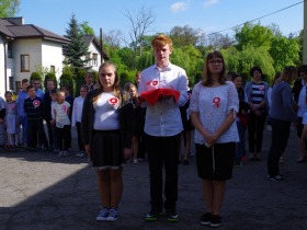 Święto Narodowe Trzeciego Maja to jedno z najważniejszych świąt w naszym kraju. W naszej szkole obchodzone było nadzwyczaj dostojnie i uroczyście, tym bardziej, że trwają obchody 100- lecia odzyskania niepodległości naszego kraju. Już kilka dni przed uroczystą akademią wszyscy uczniowie wraz z wychowawcami i panią od plastyki przygotowywali biało – czerwone kotyliony, natomiast uczniowie klas V, VI i VII pod okiem polonistki i nauczyciela muzyki ćwiczyli swoje role.