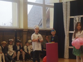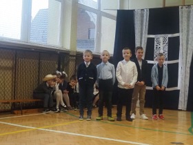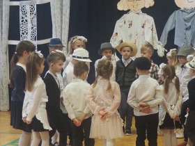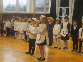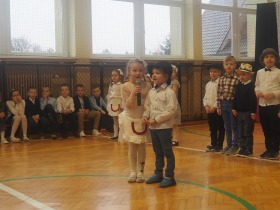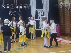 Przed tak wyjątkową widownią najpierw zaprezentowały się dzieci z oddziału przedszkolnego pod przewodnictwem wychowawczyni p. Edyty Waszak. Najmłodsi przedstawili kilka humorystycznych ciekawostek, zatańczyli, zaśpiewali, a także troszkę powspominali. Następnie uczniowie z klasy I przygotowani przez wychowawczynią p. Agnieszkę Janczak poprzez wierszyki wyrazili ogrom miłości do babć i dziadków. Pierwszak i przedszkolaki wykonały również taniec przypominający młodzieńcze zabawy dziadków - mini tango. Dzieci z klasy III pod czujnym okiem wychowawczyni p. Anny Balcerzyk przygotowały przedstawienie pt. „Tadek - Niejadek”. Była to niezwykle zabawna historia z Babcią i Dziadkiem w roli głównej. Trzecioklasiści stworzyli również akompaniament do wspólnego tańca z przedszkolakami. Z kolei uczniowie z klasy II wraz z wychowawczynią p. Martą Czerkawską zaprosili kochane Babcie i kochanych Dziadków do obejrzenia teleturnieju pt. „Babcia i Dziadek roku”. Po emocjonującym pojedynku okazało się, że ten zaszczytny tytuł przyznano każdej Babci i każdemu Dziadkowi. Tę niezwykłą uroczystość umilała cudowna grupa taneczna pod kierunkiem p. Edyty Waszak. Dzieci z niezwykłą gracją oraz muzykalnością zaprezentowały: układ taneczny „Góry do góry”, interpretację utworu „Nic dwa razy się nie zdarza” oraz taniec „Tarantela”.