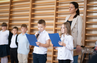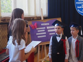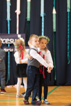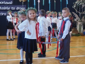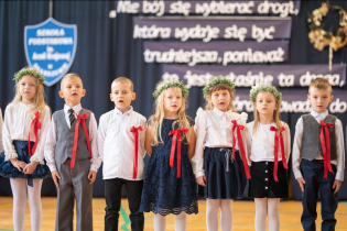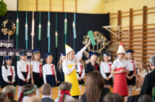 W następnej kolejności pierwszaki, przygotowane przez wychowawczynię p. Annę Balcerzyk, zaprezentowały swoje niezwykłe umiejętności. Motywem przewodnim części artystycznej były postacie przebrane w kolorowe kredki, które egzaminowały wspaniale przygotowane dzieci, pięknie recytujące wiersze i śpiewające piosenki.