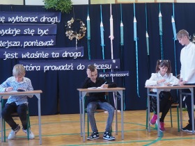 Przedstawiciele Samorządu Uczniowskiego wraz z opiekunem Panią Martą Jaśkiewicz przygotowali krótki, humorystyczny występ artystyczny dotyczący życia szkolnego.
