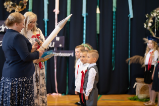 Po złożeniu ślubowania Pani Dyrektor dokonała symbolicznego pasowania na ucznia. Wielką kredką, jak czarodziejską różdżką, dotykała ramion swoich podopiecznych. Uczniowie otrzymali również swój pierwszy w życiu dokument - legitymację szkolną.