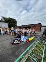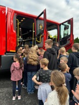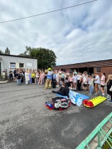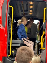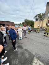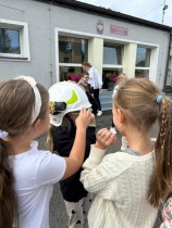 Po zakończeniu ćwiczeń na uczniów czekała miła niespodzianka – spotkanie ze strażakami. Uczniowie mieli możliwość zobaczyć z bliska wyposażenie pojazdu, dotknąć niektórych elementów sprzętu oraz posłuchać opowieści strażaków o ich codziennej pracy. To była nie tylko atrakcja, ale również cenna lekcja pokazująca, jak wiele odwagi i odpowiedzialności wymaga wykonywanie zawodu strażaka.