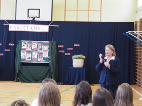 Następnie głos zabrała Pani Dyrektor, która przypomniała o znaczeniu Armii Krajowej w historii Polski. Pani Dorota Sobczak połączyła się telefonicznie z Panem majorem Kazimierzem Wiktorowiczem ps. Dąbrowa, który co roku odwiedzał naszą szkołę i brał udział w uroczystościach Dnia Patrona. Niestety zdrowie nie pozwoliło Panu Kazimierzowi odwiedzić nas w tym roku i opowiedzieć o żołnierzach, będących symbolem odwagi, poświęcenia i miłości do ojczyzny. Życzyliśmy więc Panu Wiktorowiczowi dużo zdrowia i wyraziliśmy nadzieję na ponowne spotkanie w murach naszej szkoły.