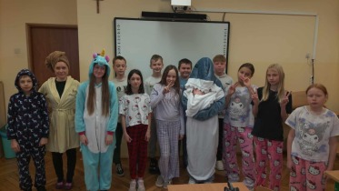 Dnia 1 kwietnia w ramach primaaprilisowego żartu uczniowie naszej szkoły ubrania zamienili na kolorowe piżamy, szlafroki i kombinezony, a także wygodne kapcie. Barwne stroje wywołały uśmiech na niejednej twarzy, bo jak tu pozostać poważnym, kiedy podczas lekcji w ławkach siedzą misie, króliczki, jednorożce czy dinozaury? :)