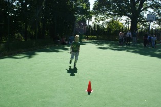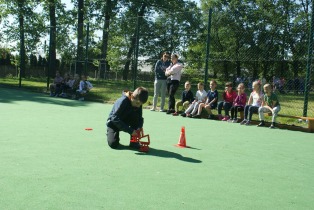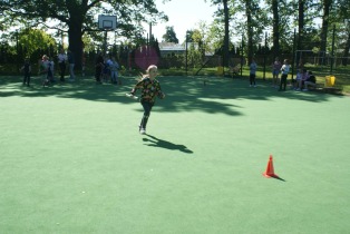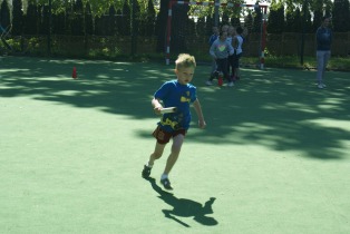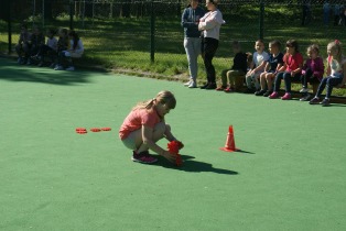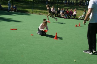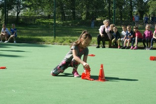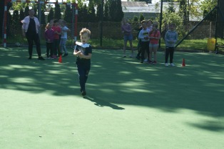 Pozostali uczniowie z klas IV-VII na boisku szkolnym zmagali się z pokonaniem sprawnościowych torów przeszkód: