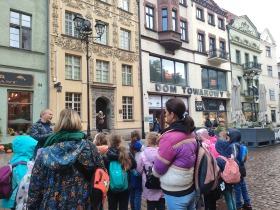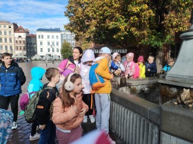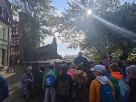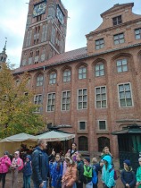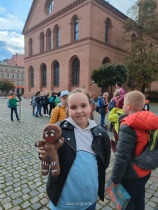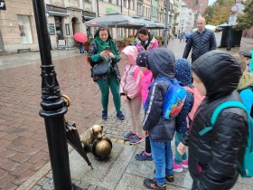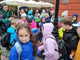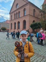 W dniu 25 października 2022 r. 30 uczniów z klas 1-3 wraz z opiekunami uczestniczyło w wycieczce do Torunia. Pierwszym punktem programu wycieczki był seans w Centrum Popularyzacji Kosmosu Planetarium Toruń. Siedząc wygodnie w fotelach oglądaliśmy seans. Nad naszymi głowami pojawiały się tysiące gwiazd wędrujących w różnych porach roku i kosmiczne animacje. Z wielkim zainteresowaniem wysłuchaliśmy wielu ciekawostek astronomicznych. Następnie wraz z przewodnikiem wyruszyliśmy na spacer po Starym Mieście. Obejrzeliśmy Krzywą Wieżę, zabytkowe kościoły, mury obronne, Ratusz. Udaliśmy się pod Dom Kopernika. Wykonaliśmy pamiątkowe zdjęcia pod pomnikiem tego sławnego Polaka. Spacerowaliśmy Piernikową Aleją Gwiazd. Mijaliśmy Dwór Artusa, pomnik Flisaka oraz zabytkowe kamienice. Wiele radości sprawiły spotkania z toruńskimi żabkami, pieskiem i osiołkiem. Ten dzień był fantastyczny! Bawiliśmy się doskonale, zajadaliśmy słynne toruńskie pierniki, a przy tym poznaliśmy zabytki kultury oraz historii Torunia. To miejsce na długo pozostanie w naszej pamięci, a będą nam je przypominały zdjęcia i zakupione pamiątki.