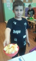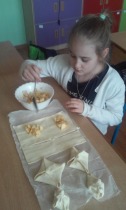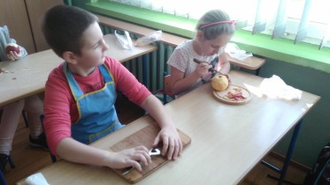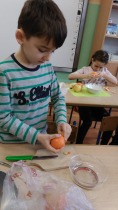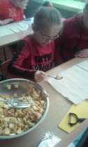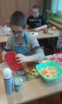 Od 5.02 do 9.02 uczniowie klasy III realizowali tematy związane z potrawami, ich smakami i zapachami. W ramach zajęć lekcyjnych dzieci próbowały różnych przypraw, poznały ich smak i zapach. W środę, 7.02., dzieci smakowały herbat z cynamonem i z kardamonem. Następnego dnia wspólnie piekliśmy ciasteczka z jabłkami. Dzieci obrały i pokroiły jabłka, po czym przygotowały ciasteczka, które wszystkim smakowały. W piątek zrobiliśmy sałatki owocowe. Każdy przyniósł swoje ulubione owoce. Były jabłka, gruszki, mandarynki, banany, winogrono i truskawki. Wszystkie dzieci bardzo dobrze posługiwały się nożem podczas obierania owoców. Pracowały w ciszy i skupieniu. Zachowały porządek na swoich stanowiskach.