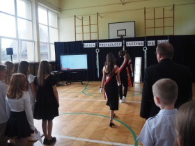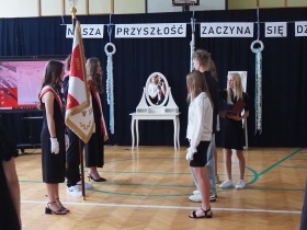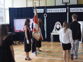 Następnie uczniowie klasy ósmej przekazali sztandar szkoły koleżankom i kolegom z klasy siódmej, symbolicznie oddając w ich ręce odpowiedzialność za kultywowanie tradycji.