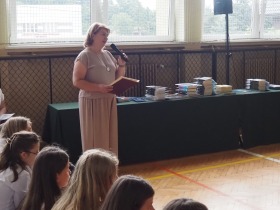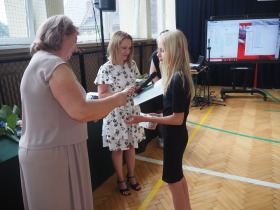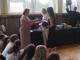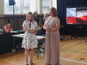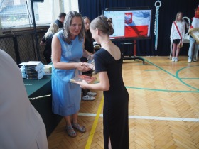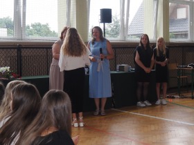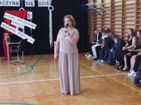 Pani Dyrektor, która w ciepłych słowach podsumowała miniony rok, gratulowała uczniom osiągnięć a szczególne słowa skierowała do absolwentów życząc im odwagi i wiary we własne możliwości na nowym etapie ich życia.