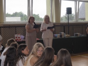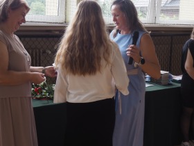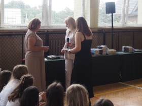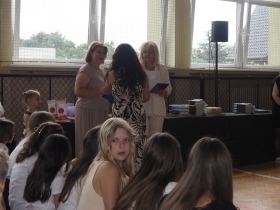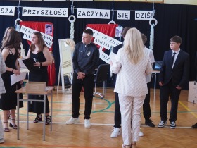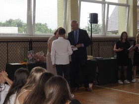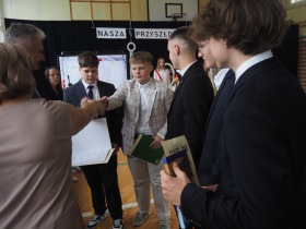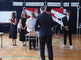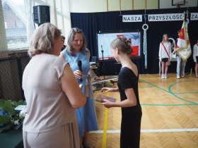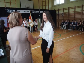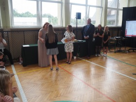 Podziękowania otrzymali również rodzice uczniów klasy ósmej, którzy aktywnie wspierali życie szkoły i angażowali się w różnorodne działania na jej rzecz. W uznaniu za dobrą współpracę Pani Dyrektor wręczyła im pamiątkowe dyplomy.