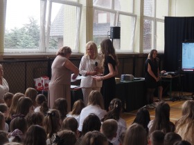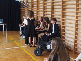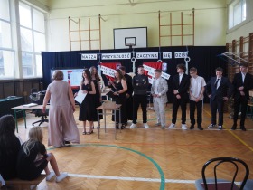 Ósmoklasiści wyrazili swoją wdzięczność wszystkim nauczycielom i pracownikom szkoły wręczając im dyplomy własnego projektu oraz symboliczne puchary wykonane na drukarce 3D – drobne gesty jako wyraz wdzięczności za wszystkie wspólne lata.