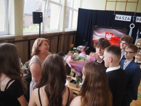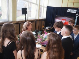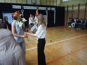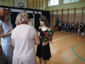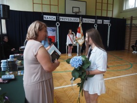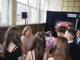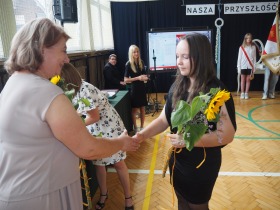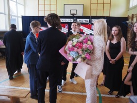 Szczególne podziękowania i kwiaty otrzymały Pani Dyrektor oraz Wychowawczyni klasy ósmej – za serce, za wsparcie i obecność przez wszystkie szkolne lata.