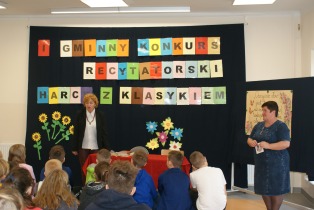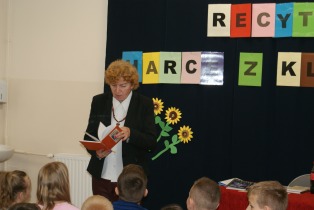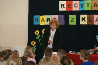 Tego dnia w naszej szkole odbył się I Gminny Konkurs Recytatorki „Harce z klasykiem”, które swoją obecnością uświetniła kaliska poetka. Pani Urszula Zybura pełniła rolę jednego z jurorów. Po konkursie miało miejsce spotkanie autorskie uczniów nasze j szkoły z aforystką. W dowcipny, a czasem nieco ironiczny sposób, Pani Zybura opowiadała o sobie, swojej twórczości, zainteresowaniach, a także recytowała fragmenty swoich wierszy. Udzielała odpowiedzi na zadawane przez uczniów pytania, wzbogacając je anegdotami ze swojego życia. Na prośbę uczniów zaprezentowała fragment utworu w języku esperanto, do nauki którego zachęciła młodzież. Następnie zwróciła się do uczniów w języku rosyjskim, czym zaskarbiła sobie ich podziw.