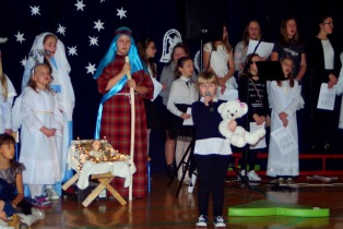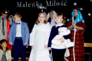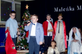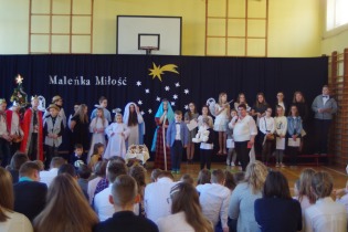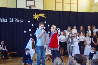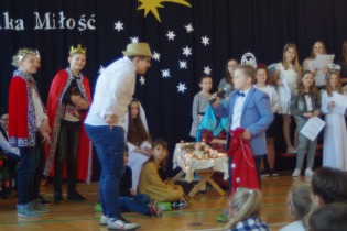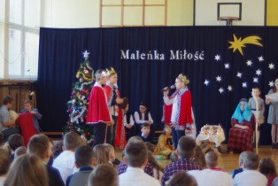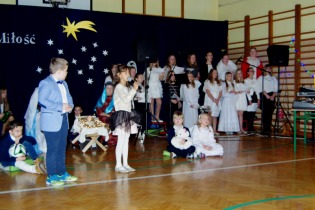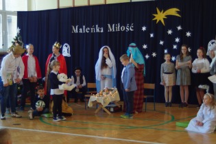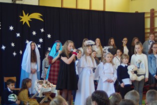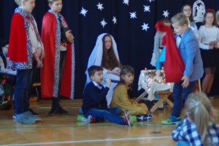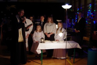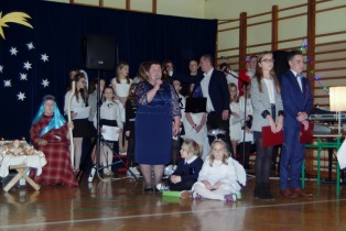 Tego wieczoru, zazwyczaj rozgadani i rozbawieni uczniowie, w ciszy i skupieniu, z anielskimi uśmiechami na buziach, oczekiwali na swój świąteczny występ. Poprzedziło go powitanie gości przez Panią Dyrektor Magdalenę Mikołajczyk słowami: „ Maleńka Miłość niech zrodzi się w każdym z nas, w każdej rodzinie, w naszej szkole. Dziękuję przyjaciołom szkoły, sponsorom, rodzicom za wszelkie dobro”. W klimat zbliżających się świąt wprowadziły słowa ks. Grzegorza Mituły, przypominające historię i rangę opłatka, którym się dzielimy w Wigilię Bożego Narodzenia oraz odczytanie fragmentu z Pisma Świętego. Następnie wszyscy mieli okazję złożyć sobie życzenia, które wypływały z głębi serca. W tle Trzej Mędrcy ze Wschodu przestępowali już niecierpliwie z nogi na nogę, w oczekiwaniu na jasełka sprawdzając, czy aby złoto, kadzidło i mirra nie uległy zniszczeniu.