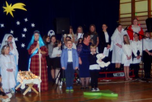 Teraz już nastał czas jasełek i kolędowania. Artyści z ogromnym zaangażowaniem i przejęciem recytowali perfekcyjnie wyuczone i wielokrotnie ćwiczone pod okiem ks. Damiana Weissa kwestie. Niezwykły klimat tworzył chór, któremu akompaniował p. Zbigniew Błaszczyk.