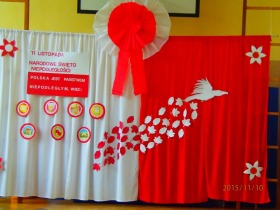 Na sali wisiał ogromny kotylion i biało-czerwony materiał, na którym był wielki orzeł, a za nim leciały liście. Widniał też napis: „11 listopada – Narodowe Święto Niepodległości. Polska jest państwem niepodległym.”