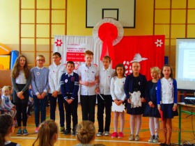 Gdy wszyscy już zebrali się na miejscu, wspólnie zaśpiewano Mazurka Dąbrowskiego, po czym uczniowie przystąpili do zaprezentowania poszczególnych pieśni. Młodym śpiewakom przygrywał nauczyciel muzyki - pan Tomasz Smoliński. Kiedy wspaniałe pieśni patriotyczne zostały odśpiewane, głos zabrała Pani Dyrektor. Podziękowała ona wszystkim pracownikom szkoły za trud włożony w przygotowanie apelu oraz przypomniała o obowiązku wywieszenia flagi w Narodowe Święto Niepodległości.