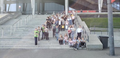 Pięć godzin później dotarliśmy do stolicy. Zwiedzanie Warszawy rozpoczęliśmy od wizyty na PGE Narodowy. Jest wśród nas wielu kibiców piłki nożnej i wizyta na tym stadionie była spełnieniem naszych marzeń. Gdy weszliśmy na trybuny i wspięliśmy się na ich szczyt, z góry podziwialiśmy ogrom tego obiektu. Naprawdę, robi wrażenie!