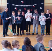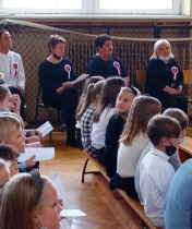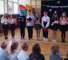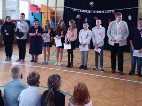 Ponadto dzisiejszy dzień był wyjątkowy, ponieważ również wszyscy uczniowie wzięli udział w Akademii i - jak powiedziała Pani Dyrektor- stali się bohaterami podczas wspólnego spotkania. Każda klasa bowiem musiała wybrać i przygotować jedną z pieśni wojskowych, które następnie uczniowie odśpiewali podczas Akademii. Pomagali wszyscy nauczyciele i oczywiście wychowawcy.