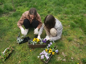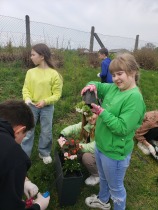 Laureatom gratuluję, a wszystkim uczestnikom dziękuję za udział w konkursie. Uczniowie klas 0-8 przynieśli sadzonki roślin do posadzenia w donicach przed szkołą. Wybrani przedstawiciele uczniów klasy 4a oraz klasy 7a pod opieką pani Moniki Raniś i Izabeli Śmieszniak posadzili kwiaty przed głównym wejściem do budynku.