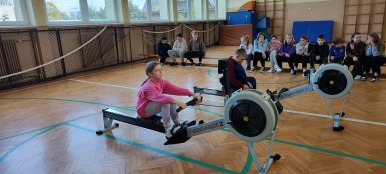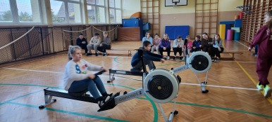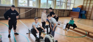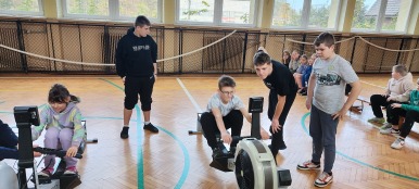 Nasza szkolna sala gimnastyczna została wyposażona w ergometry wioślarskie na których uczniowie klas V-VIII mieli szansę spróbować swoich sił pod okiem trenera, który udzielał cennych wskazówek dotyczących techniki wioślarskiej oraz motywował do osiągania lepszych wyników.