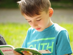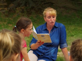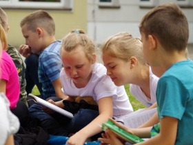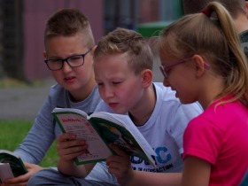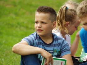 Trzecia klasa czyta na trawie