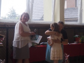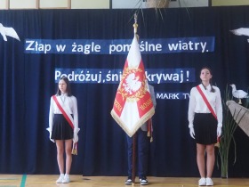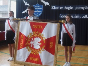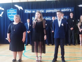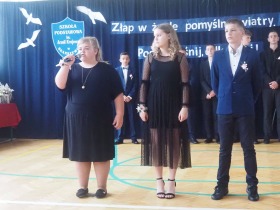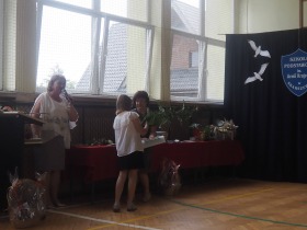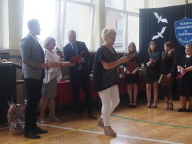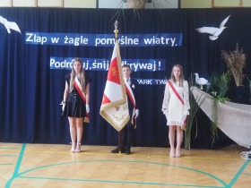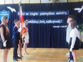 Nastąpiło również oficjalne przekazanie sztandaru szkoły przez poczet sztandarowy uczniom, którzy w przyszłym roku szkolnym będą pełnić tą zaszczytną funkcję.