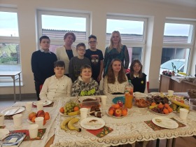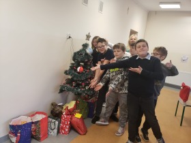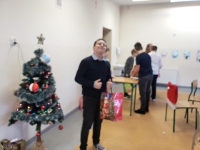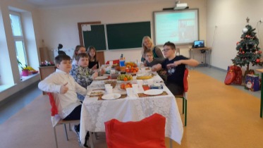 Na stołach zamiast zeszytów i książek pojawiły się potrawy przygotowane przez uczniów i rodziców m.in. pierogi z kapustą i grzybami, kapusta z grochem, ryba po grecku, makiełki, ciasto brownie, piernik, sałatka warzywna i owoce. Pod choinką pojawiły się prezenty. Śpiewaliśmy kolędy, łamaliśmy się opłatkiem. Był dziś również czas na swobodne rozmowy, na integrację, na gry i na budowanie relacji. Wigilia to oczekiwanie na Boże Narodzenie to czas nadziei i radości. Chcielibyśmy aby ta nadzieja i ta radość w sercu towarzyszyły nam przez cały okres Świąt i także w każdym kolejnym dniu. Życzymy Państwu i sobie wytrwałości w pielęgnowaniu nadziei i radości, która dziś gości naszych sercach.