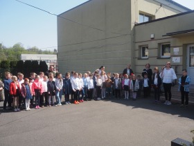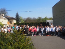 Uczniowie klasy V przybliżyli wszystkim to ważne i znaczące historyczne wydarzenie, przygotowując montaż słowno – muzyczny. W śpiew piosenki „Witaj maj, 3 maj” włączyli się wszyscy uczniowie oraz pracownicy szkoły, a echo ich niosło się po całej okolicy.