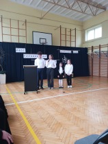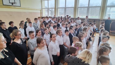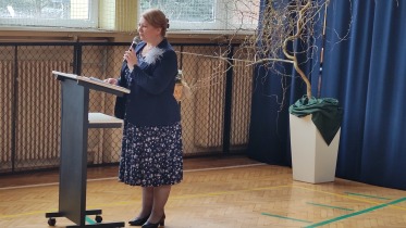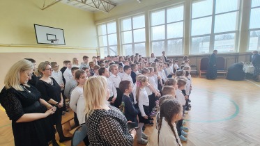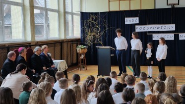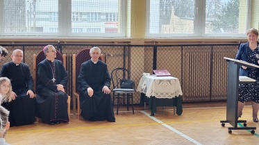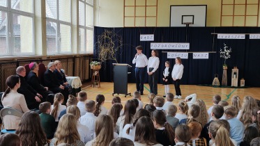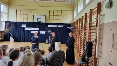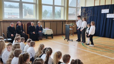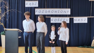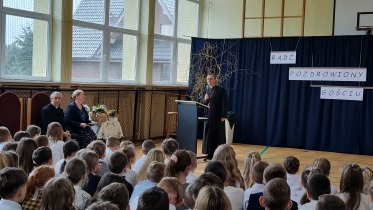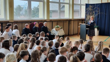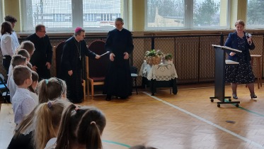 Na powitanie społeczność szkolna przywitała zacnego gościa piosenką "Bądź pozdrowiony gościu nasz". Następnie uczniowie naszej szkoły skierowali słowa powitania do ks. Biskupa, dzieląc się swoimi rozterkami, ale i radościami oraz prosząc o błogosławieństwo. Społeczność szkolna złożyła w przeddzień imienin również życzenia Księdzu Proboszczowi Grzegorzowi. Następnie czcigodnego gościa powitała Pani Dyrektor Dorota Sobczak. Przywołała pasterskie credo ks. Biskupa: „Miłość Chrystusa przynagla nas” jako wspólny element posługi zarówno duchowieństwa jak i pracowników oświaty wobec bliźniego. W odpowiedzi na zaproszenie ks. bp. zwrócił się do zebranych podkreślając, jak wielką wartością dla dzieci i młodzieży jest możliwość nauki, ale i wzrastanie w miłości. Podkreślił, jakie znaczenie ma możliwość przebywania wśród rówieśników w szkole oraz jak ważne jest pomaganie we wzrastaniu wszystkim bez wyjątku uczniom. Ksiądz Biskup wyraził swoją wdzięczność wszystkim nauczycielom i pracownikom za trud wkładany w wychowanie młodego pokolenia.