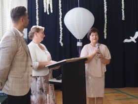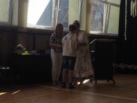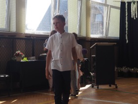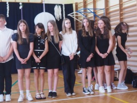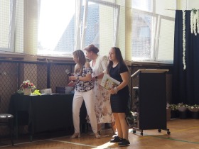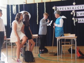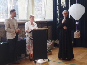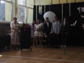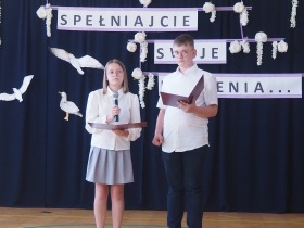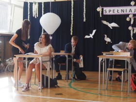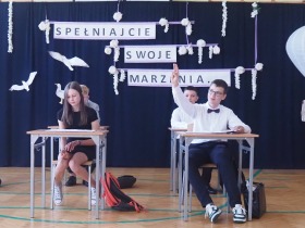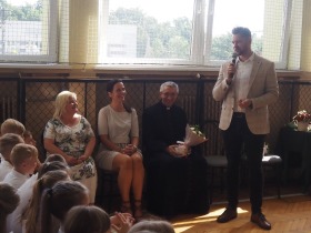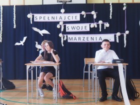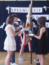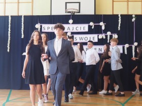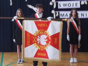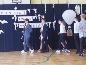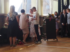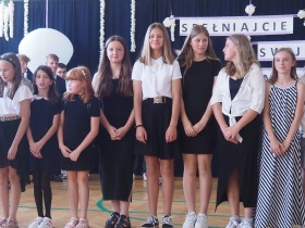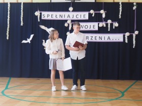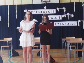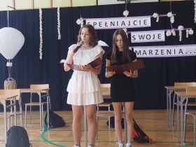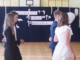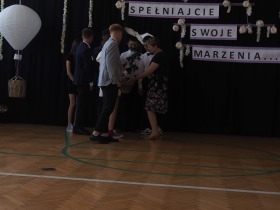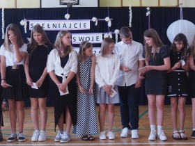 W tym roku szkolnym pożegnaliśmy naszych absolwentów klasy ósmej mottem: "Spełniajcie swoje marzenia...". Samorząd uczniowski powitał zgromadzonych gości: Pana Wójta Michała Kraszkiewicza, Panią Dyrektor Dorotę Sobczak , zaproszonych rodziców, uczniów oraz grono pedagogiczne. Uczniowie pięknie zatańczyli poloneza, a w części artystycznej przedstawili śmieszne skecze wzięte z życia naszej szkoły. Była godzina wychowawcza, lekcja języka polskiego i angielskiego, lekcja muzyki, biologii i matematyki. Wszystko "przyprawione" odrobiną humoru i zabawy, nawet nasza "Pani Woźna- grana przez Szymona" miała swoje 5 minut na kontrolę obuwia wśród uczniów. Pięknie zaprezentowali się również uczniowie klasy siódmej, którzy przygotowali tradycyjne echo o każdym z uczniów klasy ósmej i jeden utwór dedykowany dla wychowawcy kl. 8 - Pani Agnieszki Bryły. Po części artystycznej nastąpiło uroczyste przekazanie Sztandaru Szkoły, odśpiewanie hymnu państwowego i wręczenie świadectw z wyróżnieniem dla uczniów kl. 4-8. Pani Dyrektor oficjalnie pożegnała także odchodzących pracowników szkoły: Panią Elżbietę Kupaj - nauczyciela matematyki, Księdza Grzegorza Mitułę - uczącego religii i Panią Agatę Magdzicką - pedagoga specjalnego. Na koniec były podziękowania, wspomnienia, przemówienia, kwiaty oraz bardzo miłe spotkanie przygotowane przez Radę Rodziców z klasy ósmej. DZIĘKUJEMY!