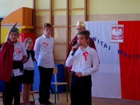 Po tym niezwykle podniosłym momencie nastąpiła równie uroczysta akademia. Uczniowie przypomnieli wydarzenia sprzed ponad 200 lat, pokazując, jak postępowym i nowoczesnym krajem była Rzeczpospolita. Pięknym recytacjom poezji patriotycznej towarzyszyły dźwięki piosenki „Witaj majowa jutrzenko!” oraz dekoracje, rekwizyty i stroje, które pomogły w zrozumieniu jakże ważnych, a zarazem trudnych treści.