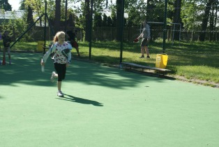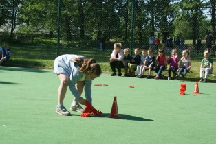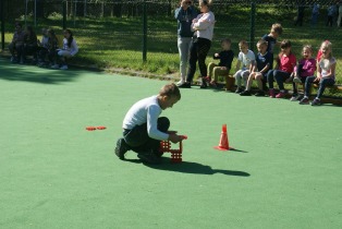 Pozostali uczniowie z klas IV-VII na boisku szkolnym zmagali się z pokonaniem sprawnościowych torów przeszkód: