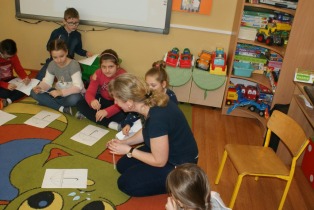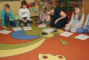 Zadania miały na celu ćwiczenie aparatów artykulacyjnych: warg i języka. Dzieci pracowały tez nad prawidłowym torem oddechowym. Dmuchając na kartki papieru sprawdzały, czy prawidłowo oddychają. Słuchając opowiadania „Sowa sprząta swoje mieszkanie”, dokładnie usprawniliśmy swoje buzie. Rozluźnieni i przygotowani do pięknej wymowy przystąpiliśmy do dalszej części zajęć, w której ćwiczenia artykulacyjne zostały połączone z zajęciami logorytmicznymi. Uczniowie maszerowali w takt piosenki „Ludowa poleczka”, pamiętając