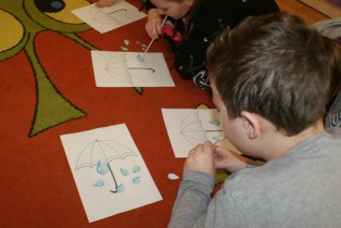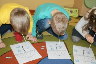W Trakcie zabaw mieliśmy możliwość sprawdzenia swojego słuchu. Dzieci odgadywały skąd pochodzą dźwięki, które usłyszały. Wszyscy świetnie poradzili sobie z tym zadaniem. Na zakończenie jeszcze raz sprawdziliśmy czy potrafimy prawidłowo oddychać. Dzieci otrzymały słomki i za ich pomocą musiały przenieść krople deszczu pod parasol. Przy tym zadaniu było mnóstwo śmiechu. Wszyscy bardzo dobrze sobie z nim poradzili.