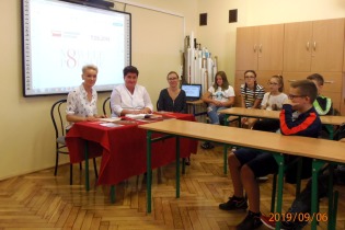 Pani Dyrektor mgr Magdalena Mikołajczyk, Pani mgr Marta Jaśkiewicz, Pani mgr Anna Popiołek (w ramach współpracy z Gminną Biblioteką w Żelazkowie) oraz reprezentanci uczniów klasy ósmej: Kacper Zawodni i Amelia Szafran. Akcję zwieńczono wspólnymi zdjęciami.