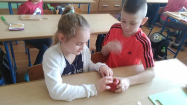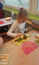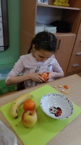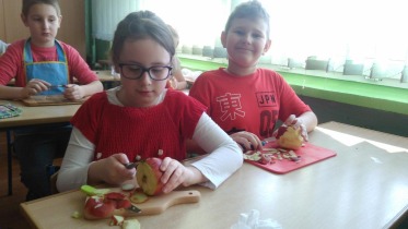 Od 5.02 do 9.02 uczniowie klasy III realizowali tematy związane z potrawami, ich smakami i zapachami. W ramach zajęć lekcyjnych dzieci próbowały różnych przypraw, poznały ich smak i zapach. W środę, 7.02., dzieci smakowały herbat z cynamonem i z kardamonem. Następnego dnia wspólnie piekliśmy ciasteczka z jabłkami. Dzieci obrały i pokroiły jabłka, po czym przygotowały ciasteczka, które wszystkim smakowały. W piątek zrobiliśmy sałatki owocowe. Każdy przyniósł swoje ulubione owoce. Były jabłka, gruszki, mandarynki, banany, winogrono i truskawki. Wszystkie dzieci bardzo dobrze posługiwały się nożem podczas obierania owoców. Pracowały w ciszy i skupieniu. Zachowały porządek na swoich stanowiskach.