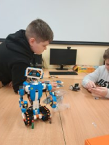 Lego Boost to robot poruszający się na gąsienicach, który może ruszać głową, ramionami i nawet brwiami. Przygodę z robotem rozpoczęliśmy od jego zbudowania. Budowa podzielona była na 3 etapy. Budowanie nie było trudne, ale pracochłonne i wymagało od uczniów wiele cierpliwości , skupienia i uwagi zwłaszcza na początkowym etapie, gdy w pudełku wciąż znajdowała się większość klocków..... Po zbudowaniu robota był czas na zainstalowanie aplikacji. Aplikacja zawiera paletę bloczków programistycznych umożliwiających utworzenie programu dla robota. Uczniowie kółka robotycznego uczą sie nie tylko programowania z pomocą różnych aplikacji ale ćwiczą wytrwałość, cierpliwość, rozwijają swoje zdolności konstrukcyjne, uczą się logicznego myślenia i współdziałania w grupie. Każdy kolejny etap konstrukcyjny lub programistyczny to kolejny sukces i radość na twarzach naszych uczniów.