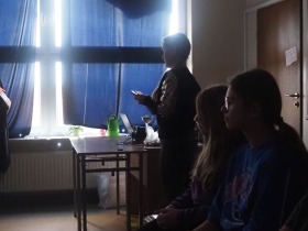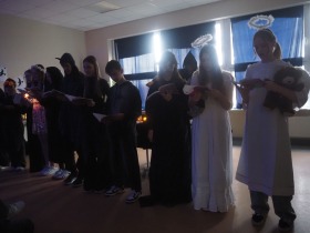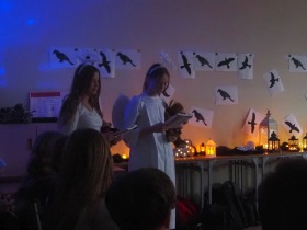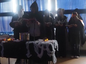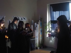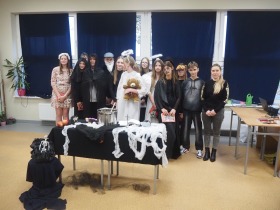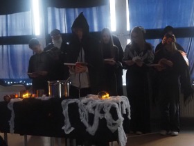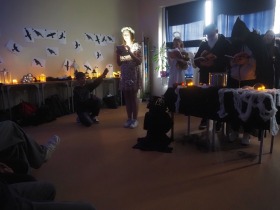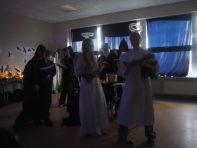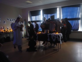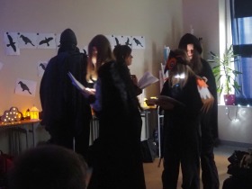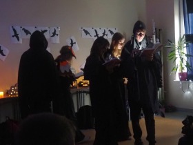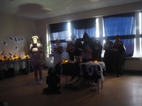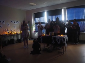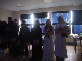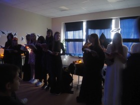 Za sprawą magii teatru i naszej wyobraźni w ten listopadowy pochmurny dzień przenieśliśmy się gdzieś na Litwę do kaplicy przycmentarnej, gdzie byliśmy świadkami niezwykłego widowiska, jakim był pogański obrzęd dziadów, polegający na wywoływaniu duchów i chęci udzielenia im pomocy. Za oknami hulał wiatr, a blask świec i lampionów tworzył tajemniczą i nieco mroczną aurę. Młodzi aktorzy z przejęciem wcielili się w swoje role, a ich kostiumy nadawały jeszcze autentyczności wydarzeniu. Guślarz przypomniał nam najważniejsze prawdy moralne, a chór dodatkowo je zaakcentował, uświadamiając nam, że: „Kto nie był ni razu człowiekiem, temu człowiek nic nie pomoże." Oby ta mądrość ludowa była obecna w naszej świadomości.