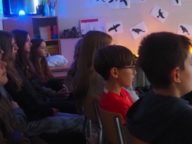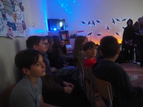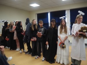 Dnia 14.11.24r. uczniowie siódmej klasy zaprosili koleżanki i kolegów z klasy szóstej i ósmej oraz nauczycieli na niecodzienną lekcję języka polskiego czyli na inscenizację „Dziadów” cz. II naszego wieszcza narodowego Adama Mickiewicza.