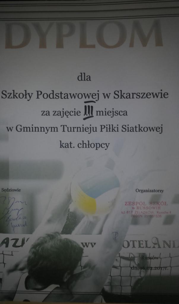 16 lutego 2017 r. w ZS w Russowie odbyły się Mistrzostwa Gminy w Piłce Siatkowej Chłopców. W turnieju tym drużyna w składzie: Krzysztof Duras (kapitan), Szymon Szałata, Jakub Olech, Filip Sieroński, Igor Marciniak, Franciszek Kurek zajęła III miejsce.